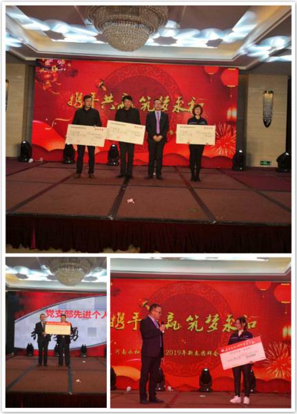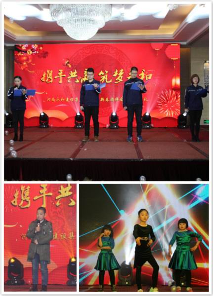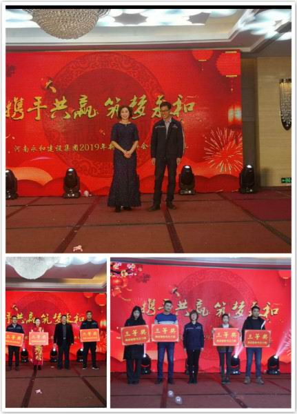 金戈鐵馬聞?wù)鞴模粻?zhēng)朝夕啟新程。2019年1月26日下午,“攜手共贏筑夢(mèng)永和”——河南永和建設(shè)集團(tuán)2019年新春團(tuán)拜會(huì)暨頒獎(jiǎng)典禮在錦江國(guó)際酒店隆重召開,信陽(yáng)市政協(xié)副主席、市工商聯(lián)主席陳豫,信陽(yáng)市平橋區(qū)政協(xié)副主席陳明德、信陽(yáng)市委統(tǒng) 戰(zhàn)部辦公室主任楊輝、信陽(yáng)市平橋區(qū)工商聯(lián)主席張虹、商城縣、羅山縣、五里辦事處等多位領(lǐng)導(dǎo)、信陽(yáng)日?qǐng)?bào)社、信陽(yáng)電視臺(tái)等多家媒體領(lǐng)導(dǎo)及新聞?dòng)浾摺⒑幽嫌篮徒ㄔO(shè)集團(tuán)有限公司全體員工及家屬、合作商,社會(huì)友人出席了本次團(tuán)拜會(huì)。大家歡聚一堂,辭舊迎新、表彰、文藝展演,共同度過(guò)了振奮人心又愉快難忘的時(shí)光。